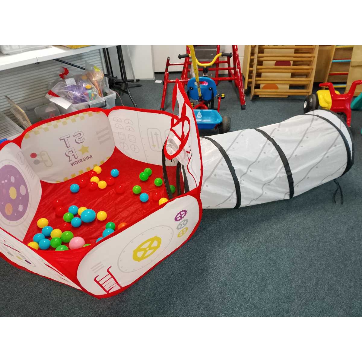 Contains: Tent poles X 4 (when fully assembled) Tunnel X 1, Ball Pit X 1, Tent X 40 balls, 10 of each red, blue, green and yellow and plastic toy library bag